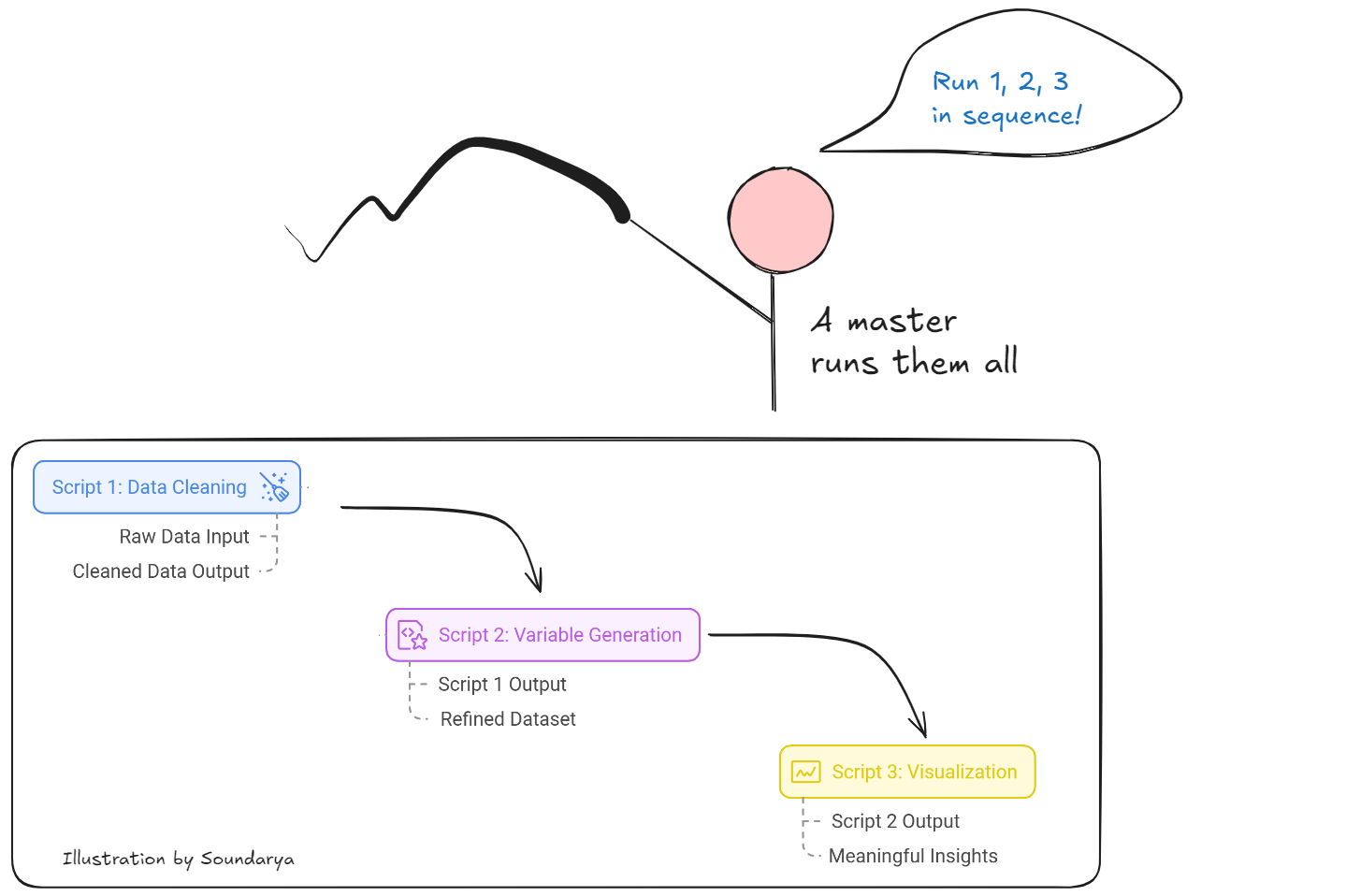 In my data analysis workflow, I use three interdependent scripts that function like a chain of command. Script 1 performs data cleaning, taking raw data and outputting a cleaned version. Building on this foundation, Script 2 generates new variables, taking Script 1’s output as its input and producing a more refined dataset. Finally, Script 3 creates visualizations, using the clean data from Script 2 to generate meaningful insights.